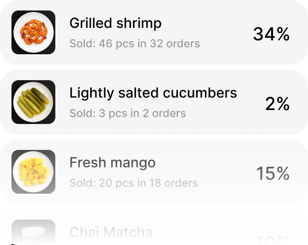 Oneflow shows which items are the real stars of your menu and which ones require attention. Instant access to % Sold and % of Revenue allows you to react quickly to trends.